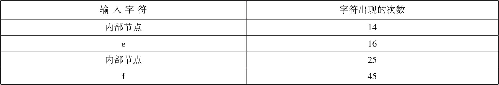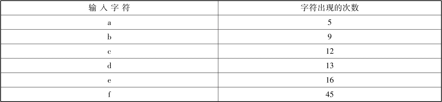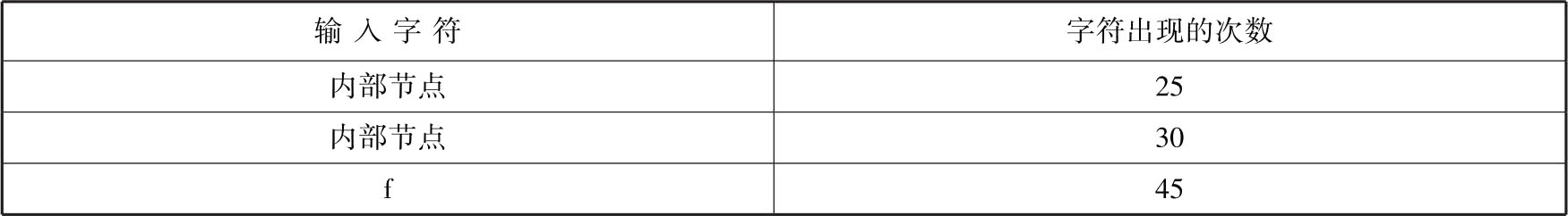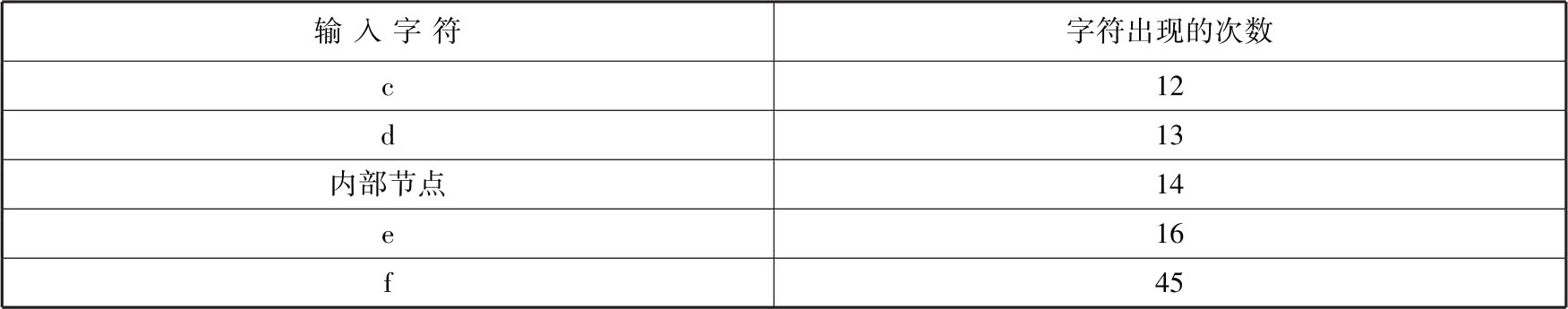 下面通过一个例子来说明哈夫曼树的构建过程。输入字符及字符出现的次数如表2.2所示。
