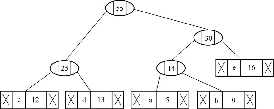 (5)从表2.5给出的堆中提取两个出现次数最少的节点。添加出现次数为25+30=55的新内部节点,如图2.14所示。