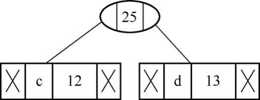 (3)从表2.3给出的堆中提取两个出现次数最少的节点。添加出现次数为12+13=25的新的内部节点,如图2.12 所示。