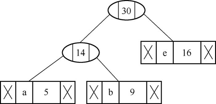 (4)从表2.4给出的堆中提取两个出现次数最少的节点。添加出现次数为14+16=30的新内部节点,如图2.13所示。