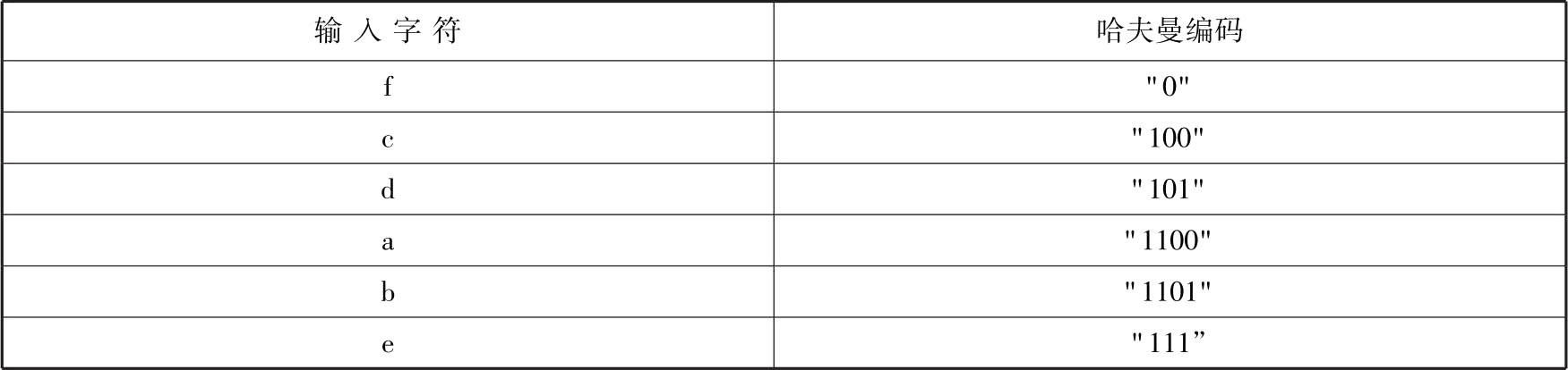 因此,对于每个输入字符的哈夫曼编码如表2.8所示。