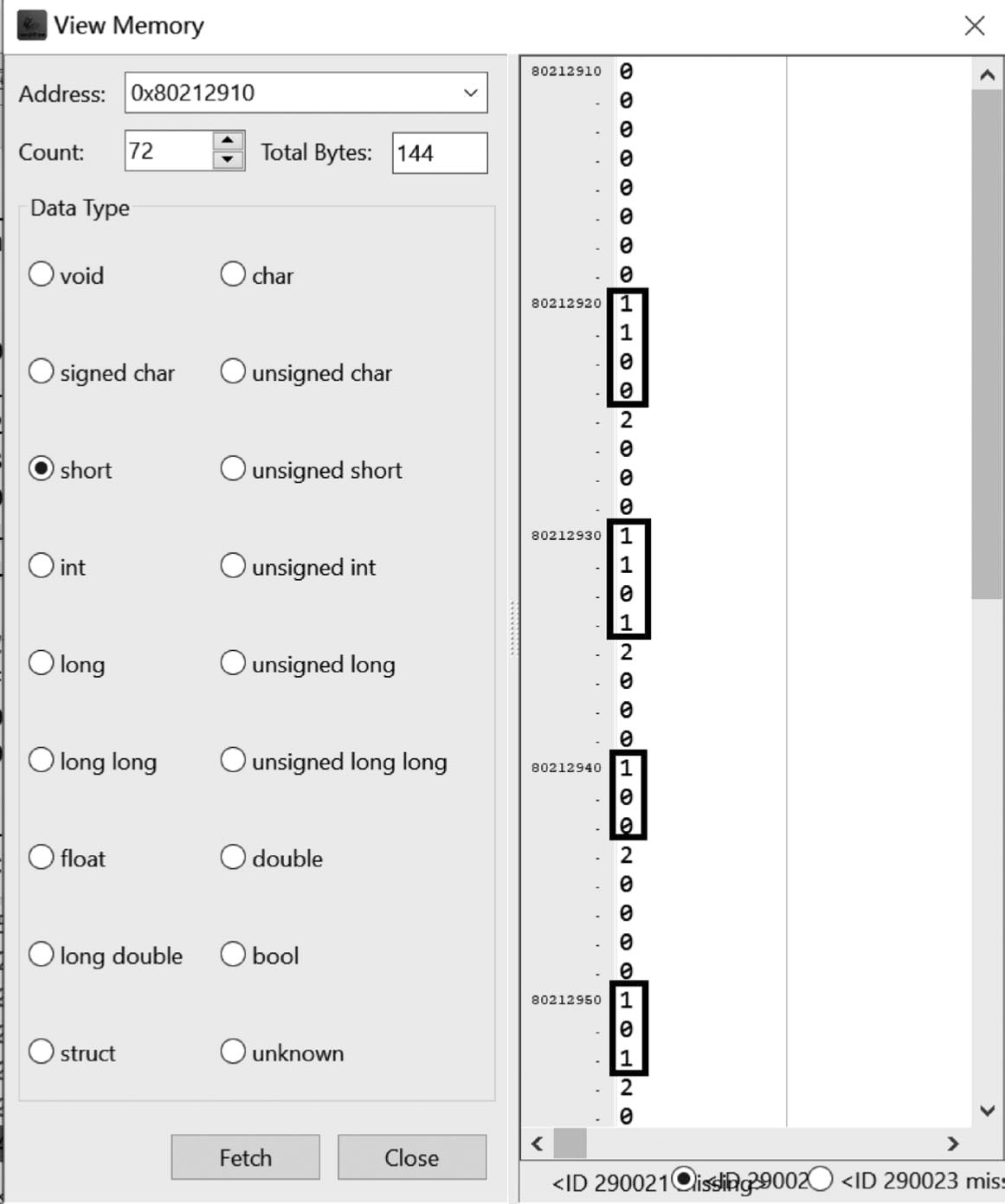 (5)弹出“View Memory”对话框,如图2.19所示。从图2.19可知,哈夫曼编码的结果保存在存储空间地址为0x80212910开始的位置。在该对话框中,设置下面的参数。
