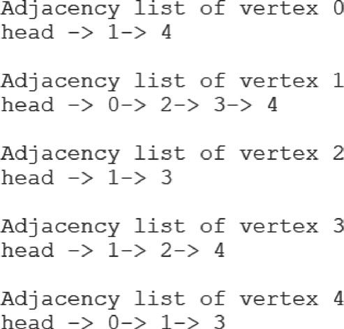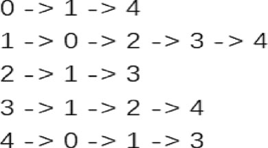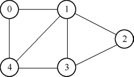 从图3.9可知,节点0分别连接节点1和节点4,节点1分别连接节点0、节点4、节点2和节点3,节点2分别连接节点1和节点3,节点3分别连接节点1、节点4和节点2,节点4分别连接节点3、节点0和节点1。