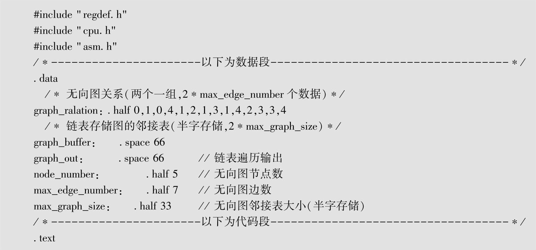 在代码清单3-6给出的C语言代码中,包含动态分配内存空间的函数malloc()。由于使用该函数会对基于汇编语言构建邻接表造成困难。因此,在分析代码中链表存储结构的基础上,使用数组代替链表实现相同操作。这种修改有如下要求: