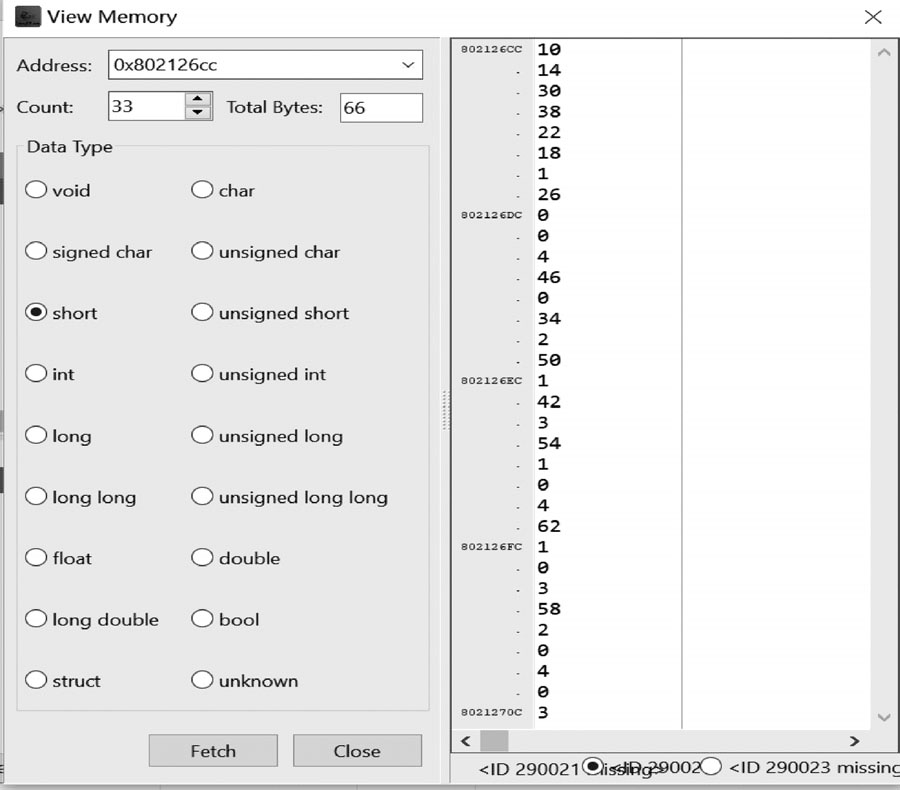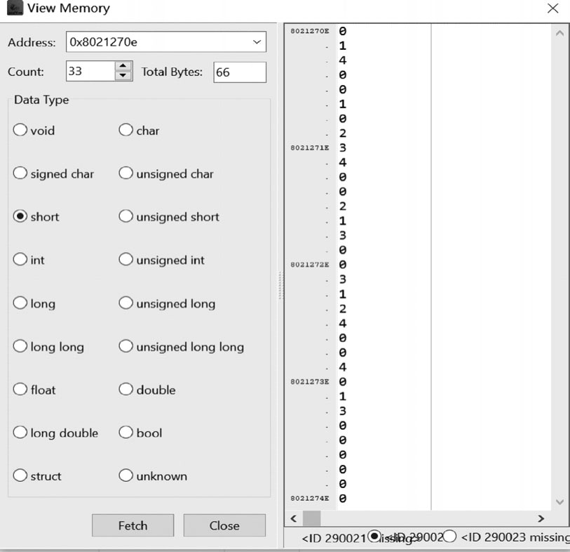 (6)单击“Fetch”按钮,在图3.13中即可给出邻接表的存储格式,即乱序的链表形式。因为数据采用半字类型存储,因此一个半字占用两个字节。