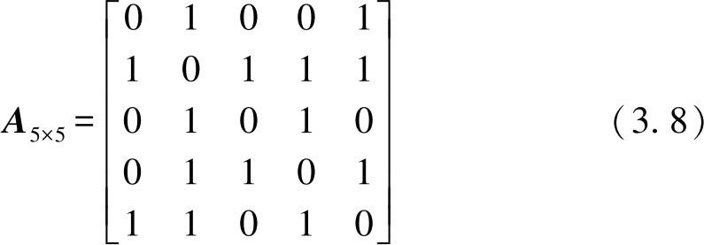 图3.8为包含5个节点的无向图。一般使用邻接矩阵和邻接列表来表示图的结构。当然,也可以使用其他的表示方式,如入射矩阵和入射列表。选择何种表示方式要根据具体情况决定,这完全取决于图的用途和要执行的操作类型。