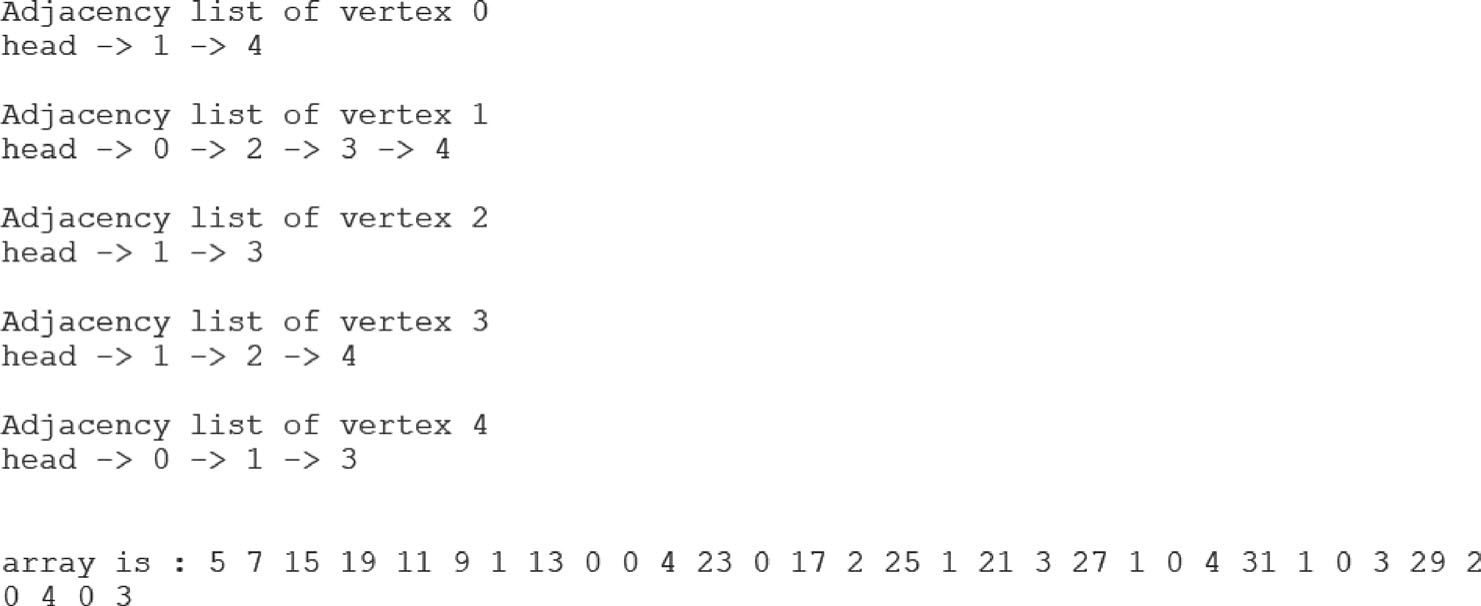 (3)在LoongIDE主界面主菜单下,选择Debug->Run,进入调试器模式,开始运行程序,在PuTTY命令行界面中即可打印出建立的邻接表信息,如图3.10所示。