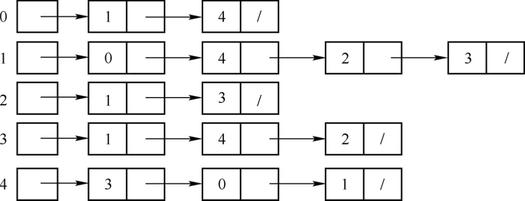 (4)不难算出,如果一个无向图有 V 个节点和 i 条边,总共需要 V 个头指针和2× i 个节点,一个节点需要两个存储单元,因此需要使用( V +4× i )个存储单元。在本节所介绍的实现中,共使用了5+4×7=33个存储单元。