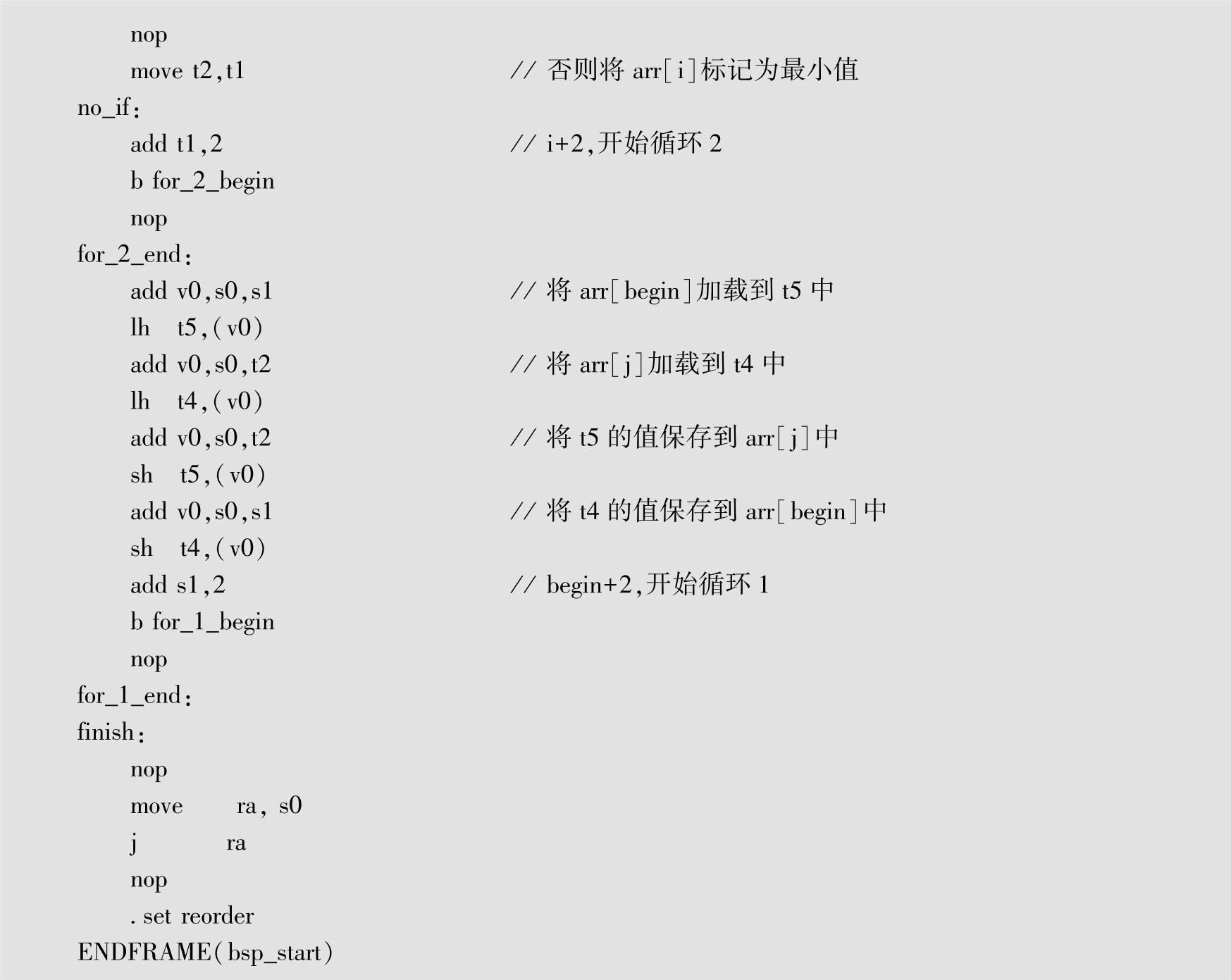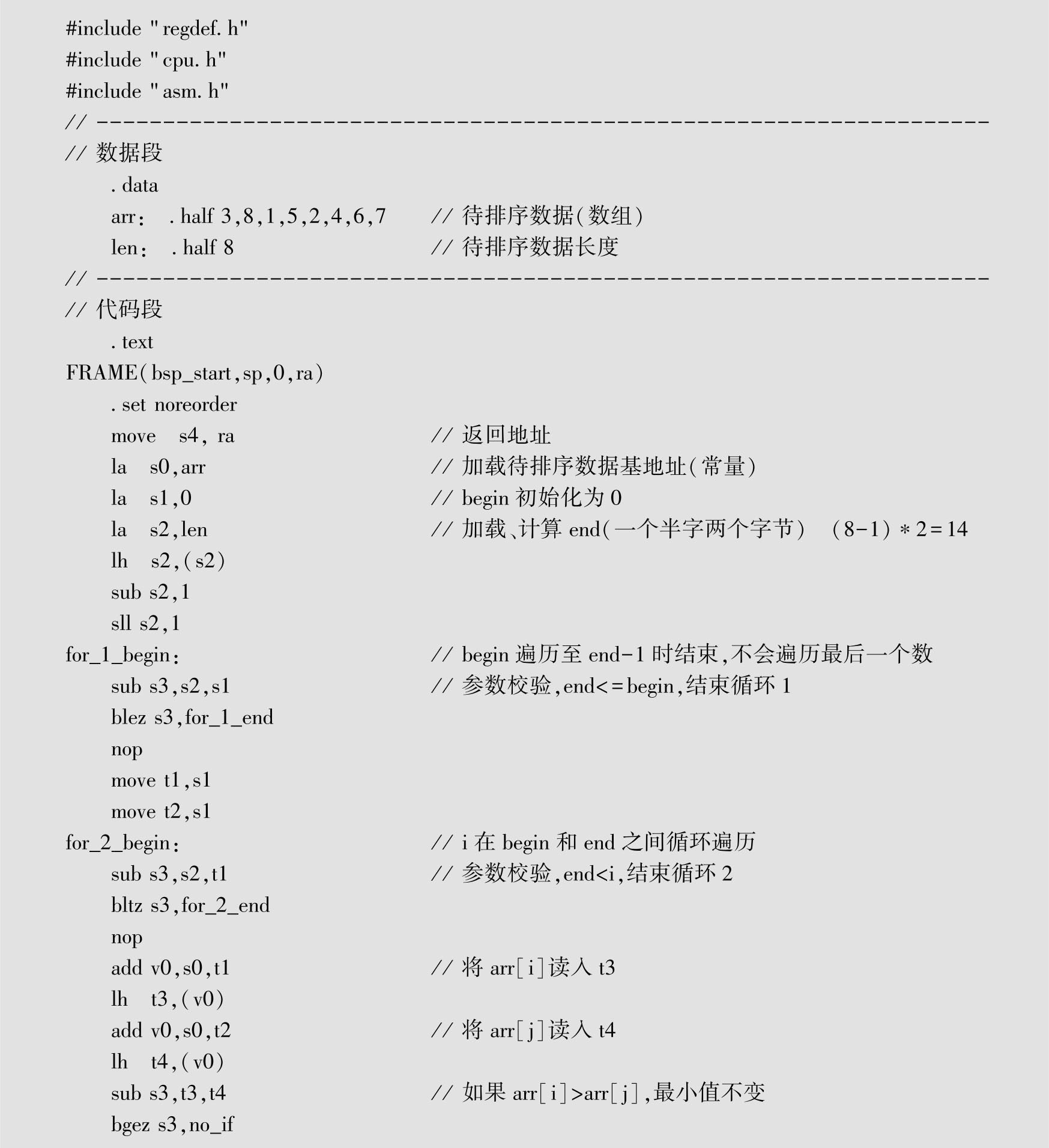 代码清单1-2 在bsp_start.S文件中添加实现选择排序算法的汇编语言代码