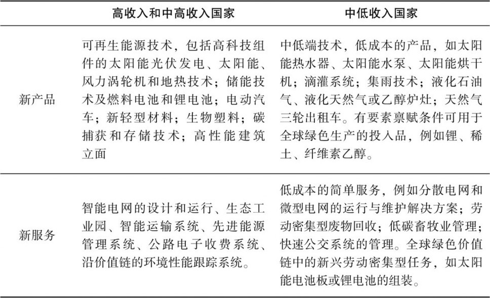 表1 不同收入水平国家的新绿色产品和服务机会