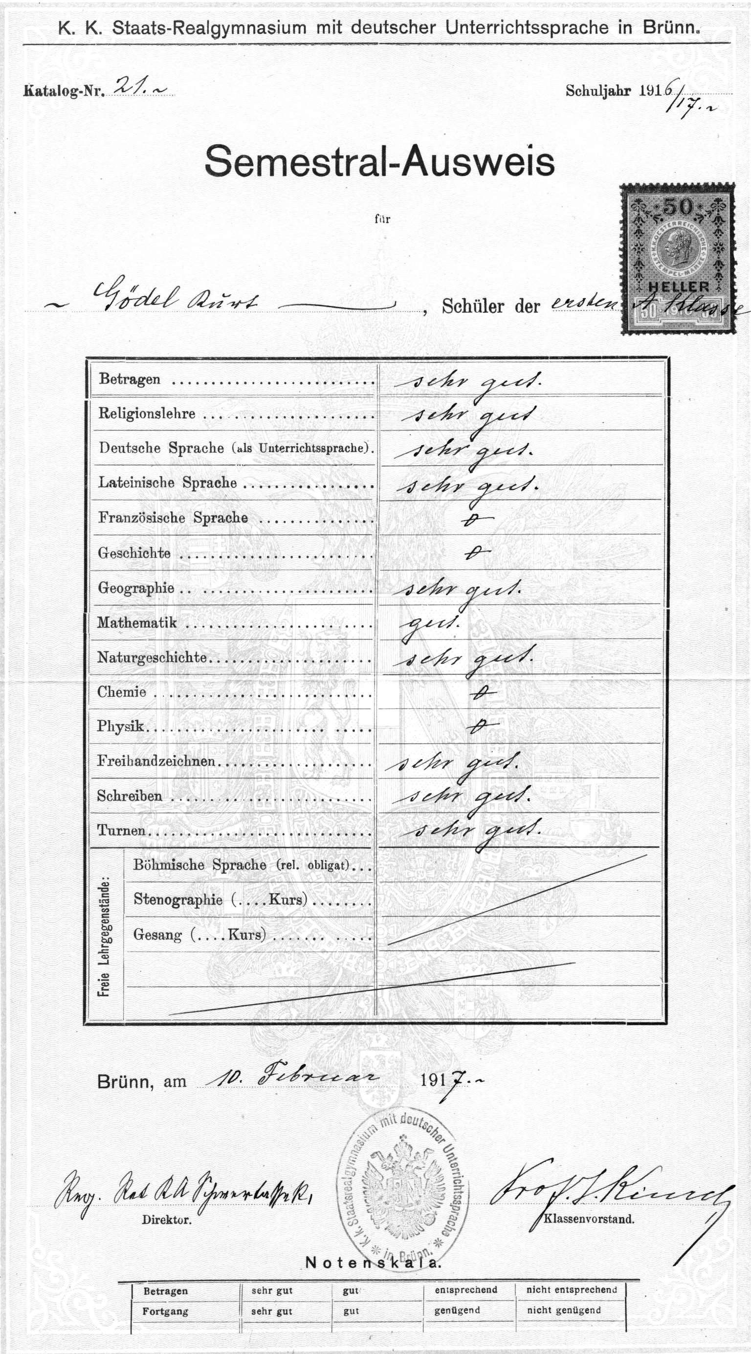 完美主义的执念自始至终都困扰着哥德尔的精神和心绪,这从他的学业成绩单里就可以看出端倪。他的每门功课都是“优异”,除了中学一年级的数学成绩是“良好”。根据鲁迪的回忆,他的弟弟是学校历史上唯一一个在8年的拉丁语学习中没有犯过任何语法错误的学生,后来这成为学校里的一段佳话。