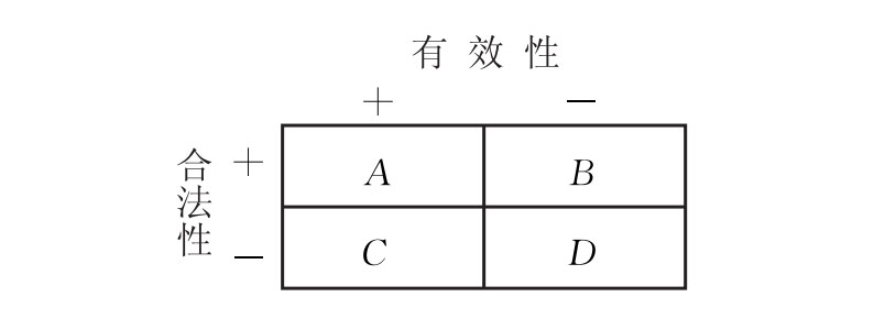 要想分析国家制度面临有效性危机时的稳定性,至关重要的是要知道这种制度的相对合法程度。对于特定政治系统来说,不同程度的合法性与有效性之间的关系,可以用下面的四元图表示;图中各种可能的组合可以说明不同国家合法性和有效性的特征。