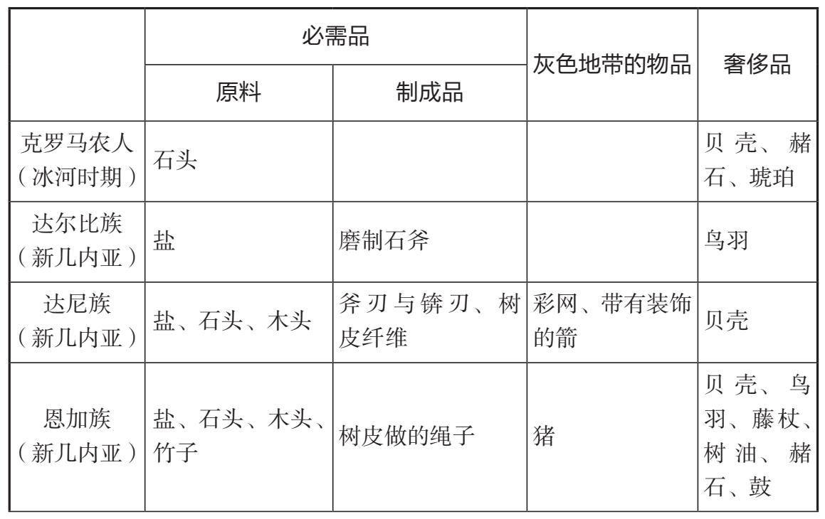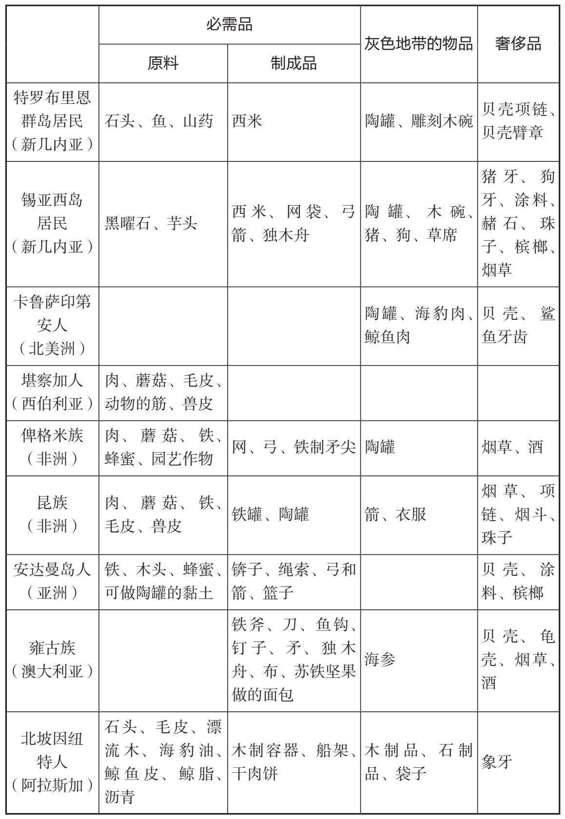 表1-1显示某些有用的原料已是全世界很多社会的交易物品,特别是可制造工具和武器的石头和金属,还有盐、食物、木头、兽皮、毛皮、制造陶罐的黏土和防水填缝用的沥青。各地社会交换的制成品包括磨制工具、武器、篮子及其他容器、编织用的纤维、袋子、网、绳子、布、衣物,以及面包、西米、干肉饼等加工食品。奢侈品和装饰品也有不少,有时当作原料交易,但通常会再加工、制造,如鸟羽、可制成项链与臂章的贝壳和龟壳、琥珀、狗、猪、鲨鱼牙齿、象牙、海象牙、珠子、树油、可当涂料和底漆的红色赭石和黑色氧化锰,以及烟草、酒、槟榔。2 000年前,来自亚洲的商人会把新几内亚天堂鸟的羽毛带到中国,之后这些羽毛又通过交易被卖到波斯和土耳其。此外,交易物品还包括一些既有用又奢侈的物品,包括猪、干海参、香料和其他昂贵的食材(相当于今日的鱼子酱),以及一些美丽的工艺品,如陶罐、雕刻的弓箭、装饰精美的袋子、衣服和草席。
