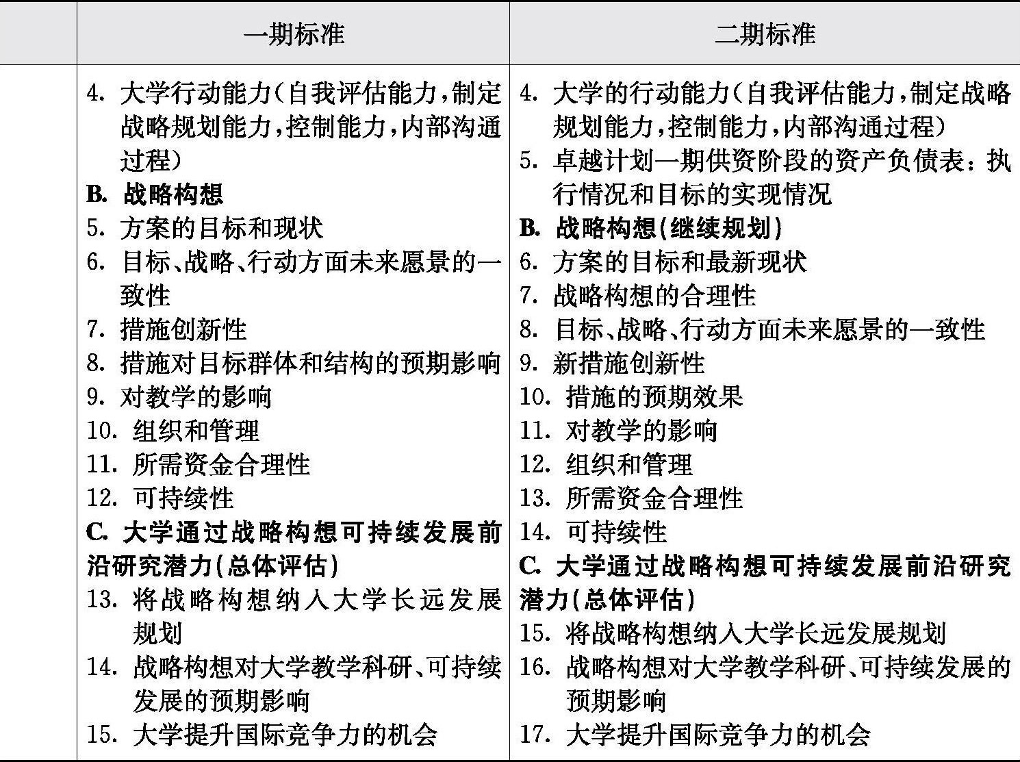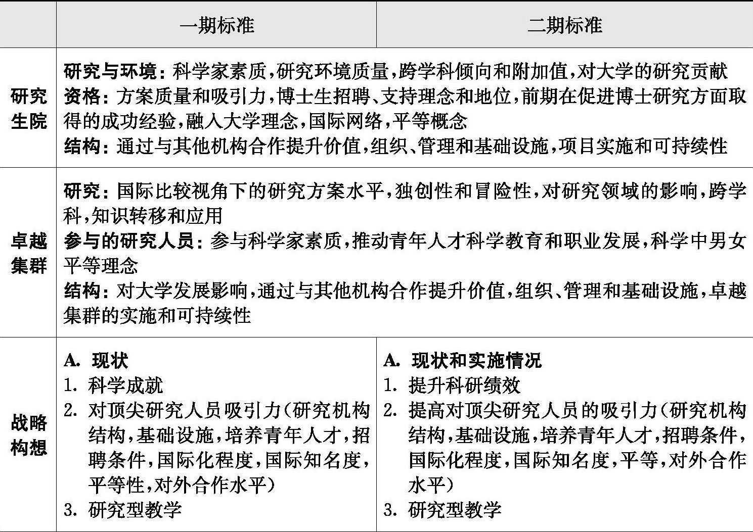 在预选拔阶段,评估标准具体有12项:科学研究的区域竞争力与影响力;科学研究愿景及其质量;教育培训的吸引力与协调性;教育的研究方向与创新性;经济合作及转型与升级能力;政策的欧洲化与国际化程度;管理的可信度与有效性;管理中定向、转换及组织能力;实施路径及程序操作;管理程序与控制的有效性;资源配置模式的质量;人力资源管理政策的目标和活力。正式选拔阶段的标准更为严格:①项目目标与整体协调,尤其是科学研究与教学和培训的协调;项目规划与实施涉及组织、人力资源和项目运作方面的协调;②项目的卓越性,包括科研质量、政策及教育培训的质量、竞争力与参与度;③项目管理与变革发展,包括追求高度自治及均衡治理、通过为项目利益相关者提供长期可持续发展的结构性目标;④项目执行能力的可信度,包括人力资源及资金的实体资源和动态资源配置、项目实施区域中资金的有效利用率、执行能力可信度的参考路径、项目资源配置各利益相关者的关联性与参与度。