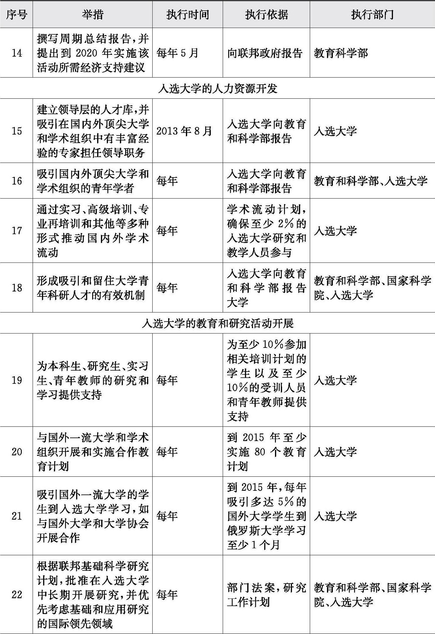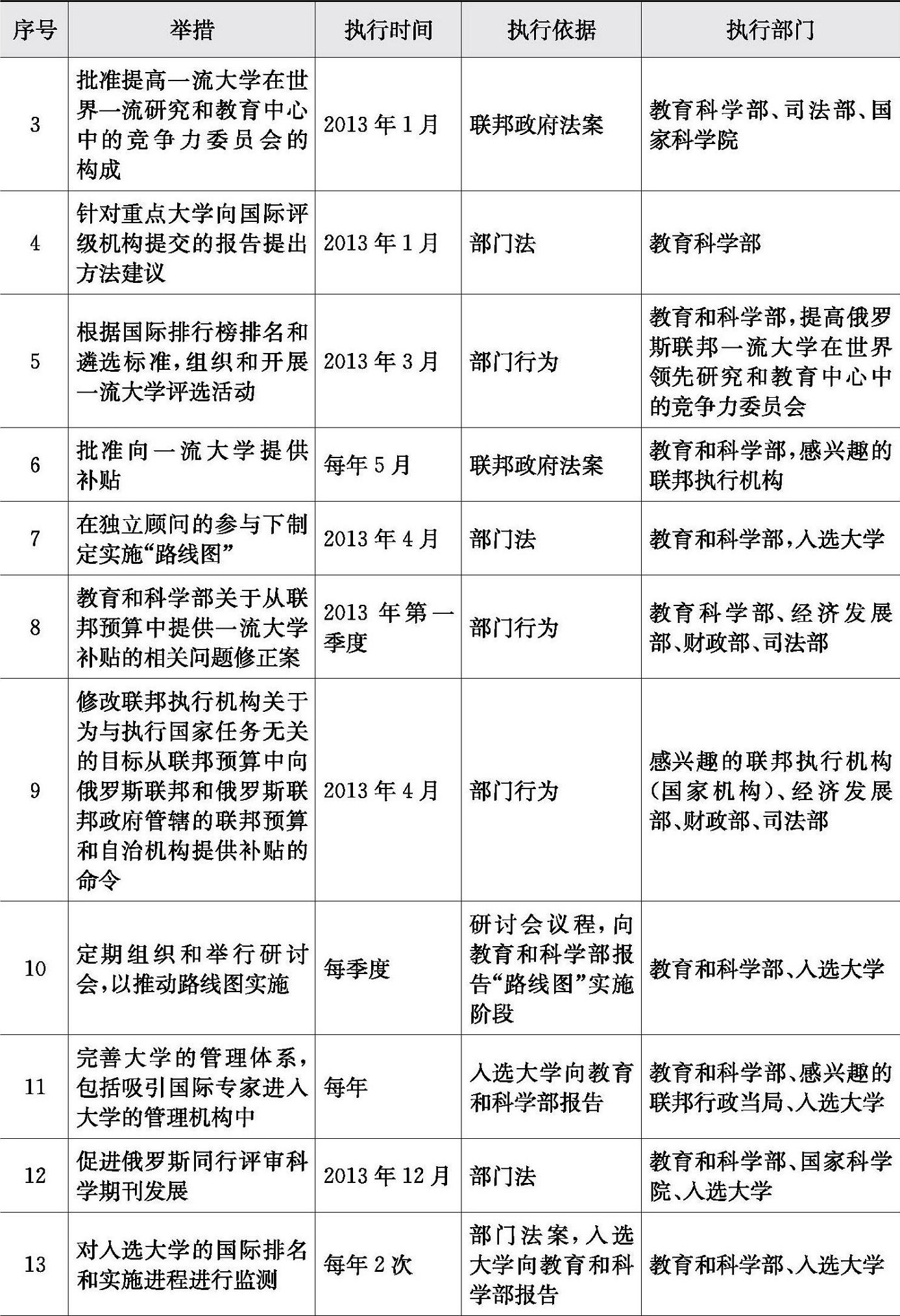 2006年3月,俄罗斯联邦政府总理梅德韦杰夫签发了N2006-r政府令《一流大学发展行动计划,旨在提高其在世界一流研究和教育中心中的竞争力》,这是俄罗斯正式提出创建世界一流大学目标后颁布的第一个国家政策性文件,也是具体实施创建世界一流大学战略的核心计划。后分别于2012年12月(N 2586-r政府令)和2016年3月(N 422-r政府令)进行了修订,最终修订文本见表1-7。