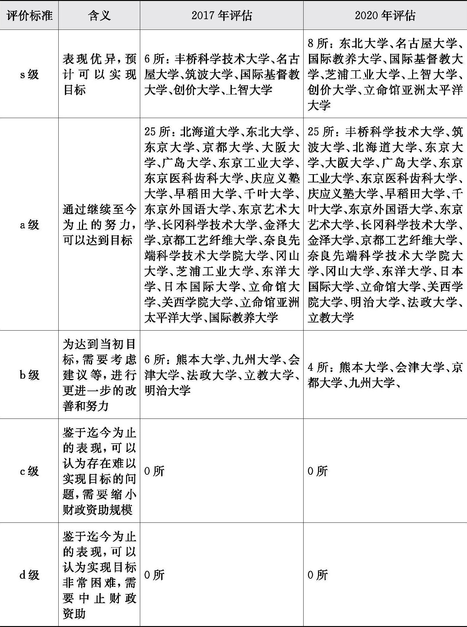 2017年,全球顶级大学项目计划委员会设立专家评估小组对入选大学在推动大学改革和彻底国际化方面的努力进行中期考核和评估。经评估,6所大学表现优异,被评为s级;25所大学被认为可以通过继续努力进而达到目标,被评为a级;6所大学被认为需要进行更进一步的改善和努力才能达到目标,被评为b级。通过此次评估可以发现入选大学取得了一些阶段性成效:一是体制机制改革,多所大学将教育改革、国际化纳入中期目标中,并进行人事管理、组织机构、外国人参与决策等体制机制改革,进一步强化校长主导的管理体制;二是积极与海外大学进行战略合作,包括开展国际共同学位计划,设立国际共同研究生院,申请海外大学的教育研究单元,与多个海外伙伴学校共享课程等;三是构建良好的国际学习环境,丰桥科学技术大学、国际教养大学等设置了留学生和日本学生共同学习的进修空间以及配备国际学生宿舍;四是改革入学考试,除了托福等分数应用于所有学科的入学考试之外,还采用新的国际标准,对入学考试数据和入学后成绩数据进行分析,实施了多维度的入学选拔;五是对具有优势的研究领域加大资金投入;六是吸收国际顾问委员会的意见,通过大学治理和运营的改革来推动国际化;七是通过吸引捐赠等方式增加自有资金以保持稳定的资金流。尽管取得了一些成效,然而总体上在接收外国留学生人数和日本学生中有海外留学经历的人数等指标上表现不佳。