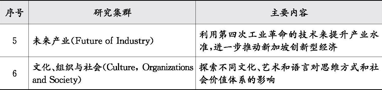 一是关注六大跨学科研究集群,应对人类社会的重大挑战。《NTU2025》规划中,NTU以解决人类面临的四大挑战为宗旨,打破传统学科边界,重点关注具有重大知识与社会影响力的人工智能与增强智能、弹性城市化与自然生态系统、大脑与学习、健康与社会、未来产业与文化、组织与社会等六大跨学科研究集群,这些挑战包括:减轻对环境的影响;掌握科学、艺术和学习技术;解决技术对人类的影响;应对健康生活和老龄化的需求和挑战。新加坡政府投资250亿新币(合190亿美元)大力推进《研究、创新与企业2025》计划,上述跨学科重点集群将得到学术研究实体机构和项目的资助,确保新加坡未来能够在相关领域确立全球公认的优势地位。六大研究集群及其主要内容如表1-6所示。