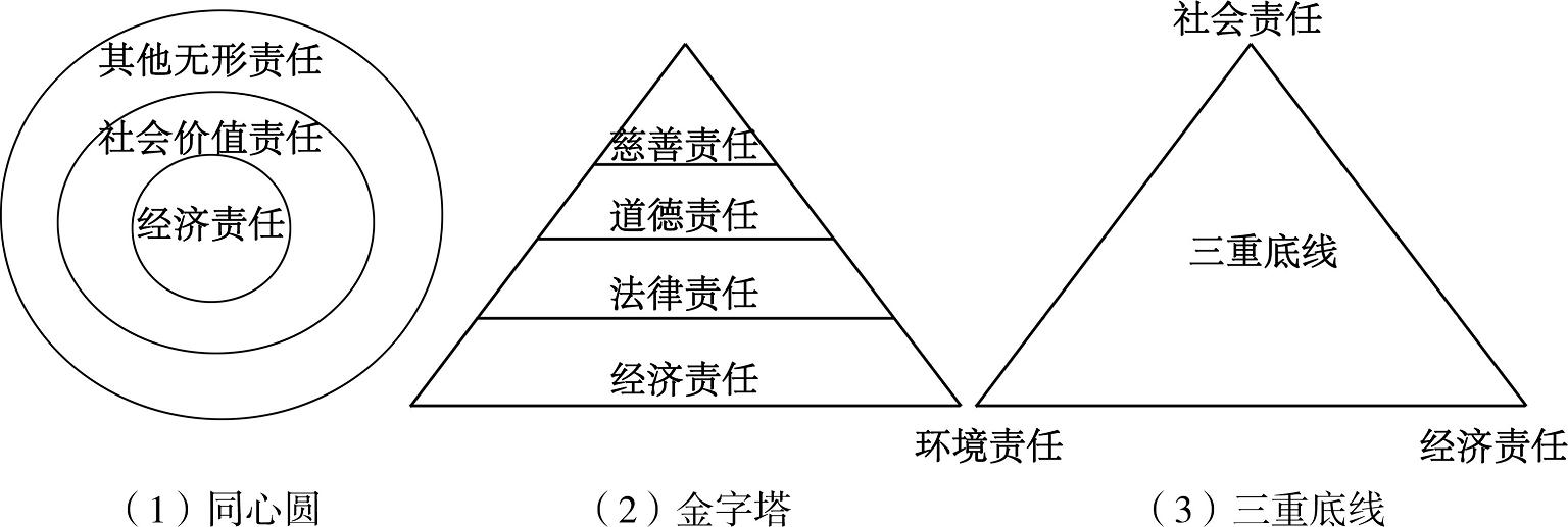 按照企业社会责任内容的范围性企业社会责任有广义与狭义之分。广义性的企业社会责任指企业在对股东利益负责的同时,还要承担对员工、消费者、社区和环境的社会责任。1970年至21世纪初,社会各界对企业社会责任进行了广泛讨论,将企业由过去单纯追求利润最大化不断地将社会责任的内涵进行拓展与充实。广义性的社会责任具有代表性的观点是“三个同心圆”“金字塔”和“三重底线”(见图2-1)。