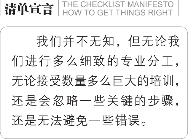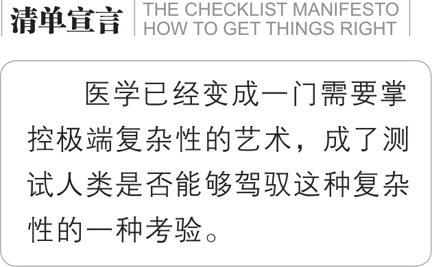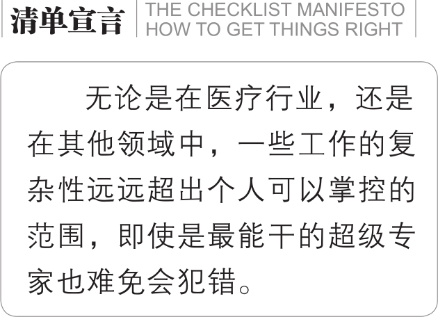 这就是现代医疗面临的主要困惑: 为了挽救垂死的病人,我们要掌握正确的知识,并确保每天对病人实施的178项治疗措施都不出错。 请注意,在治疗过程中你会受到各种各样的干扰,比如一些监视器的警报会莫名其妙地响起,临床的病人可能会吵吵闹闹,还会有护士把头探过来问你是否可以帮把手,把病人的胸部打开。这些都会让原本已经非常复杂的任务变得更加复杂,即便是进行分工都未必能应付得过来。那么,我们到底该怎么办呢?