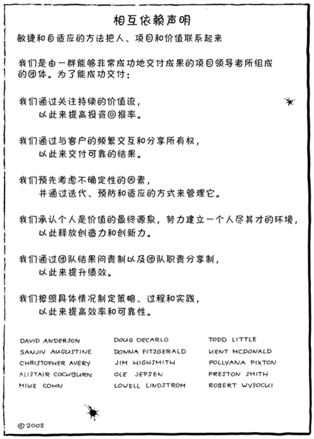 最开始的相互依赖声明主要用于项目管理。随后发现这些原则可以诠释得更加宽泛,并且应用于“一般管理”。然而,声明主要面向如何管理软件项目,而不是如何管理团队成员。这一点可以从下面的事实中得到印证:DOI的作者,也是敏捷项目领导力网络(Agile Project Leadership Network)的创建者