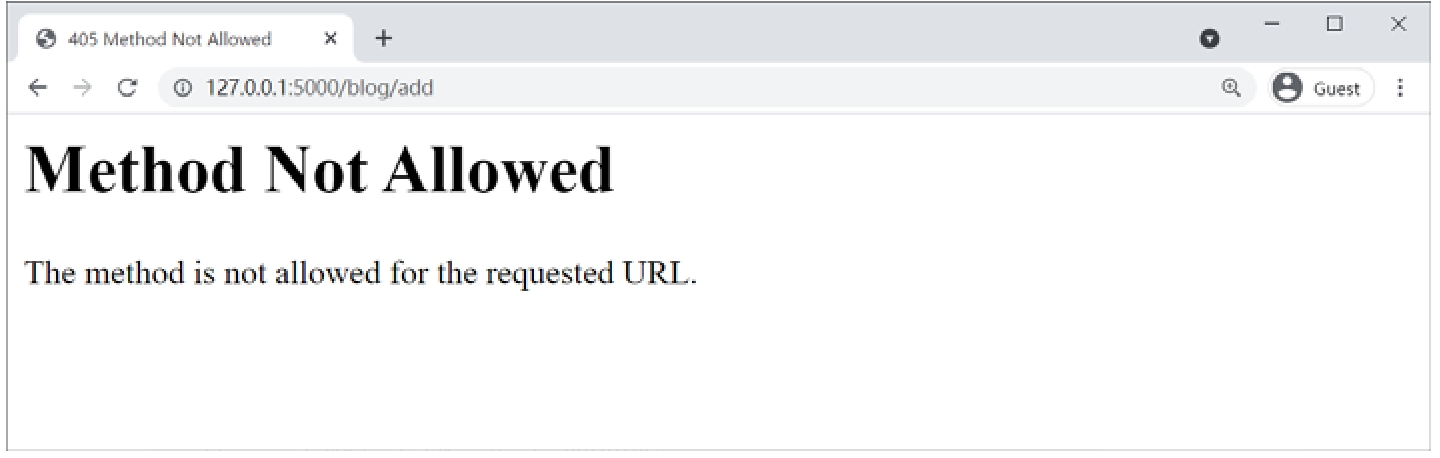 通过以上代码可以看到,在app.route中通过给methods参数赋值一个列表,并且列表中只有一个POST参数,来限制/blog/add这个URL只能通过POST方法进行访问。如在浏览器中访问/blog/add,会显示错误信息“Method Not Allowed”,如图3-11所示。