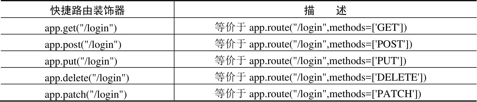 Flask从2.0版本开始,添加了5个快捷路由装饰器。如app.post表示定义的URL只接收POST请求。5个快捷路由装饰器如表3-3所示。