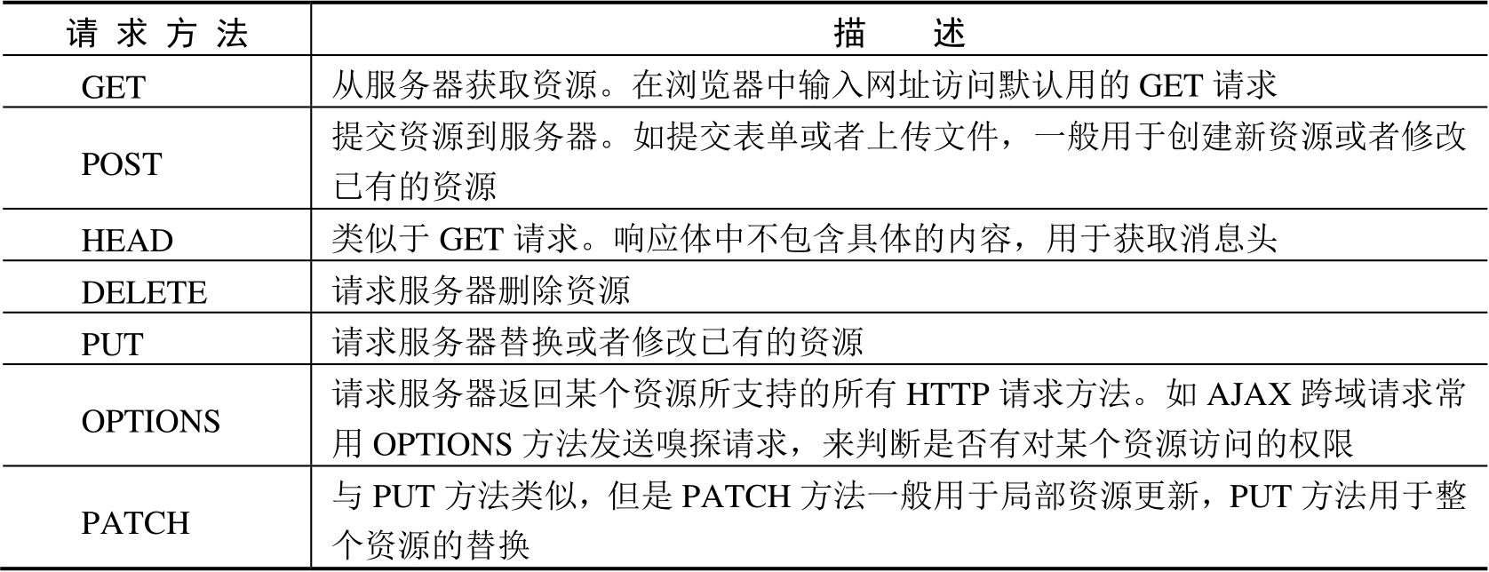 表3-2列举的HTTP请求方法,可以根据不同的场景选择不同的方法。如请求某个URL时,要获取数据,就用GET方法;要删除服务器数据,就用DELETE方法;要往服务器添加数据,就用POST方法。其他亦然。