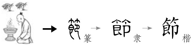 远古时代用作餐具的竹碗,以竹节为天然碗底。“节”字本义是指竹节,繁体字为“節”,字形采用“”(竹)作形旁,“即”作声旁。现在,“节”字也指紧缩、克制、自律,如“节约”等。