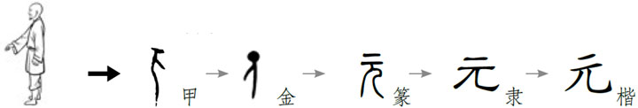 从整个字形看,“元”像是一个头发被剃光的人,侧向而立。在甲骨文的字形中,上面的一长横,指代的是人的头部。根据汉字的造字法,“元”的顶部应该是一横,其上也可再加一条短横。古代“元”和“兀”的意义相通,经常互相借用。后来,“元”又引申表示开始、第一,如“元月”,指每年的第一个月。