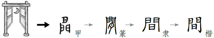 “间”是个会意字,本义为门缝。甲骨文的“间”,字形的下方像是一扇门,上方是“月”字,表示透过门缝可以隐约看到月亮,表明“间”的本义也就是细小的缝隙。现在,我们常常说“中间”“空间”“人间”“瞬间”等。“间”是个多音字,还读作jiàn,意思是间隔,后来引申为隔阂,如“离间”等。
