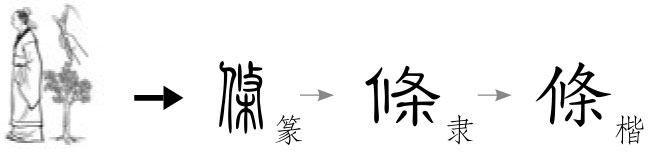 “条”字本义是指小树枝。原写作“條”,字形采用“木”作形旁,“攸”作声旁。现在,“条”字也指逐条、逐项,如“条理”,指有秩序地安排、发展或分类。