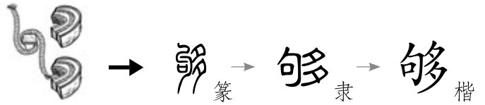 “够”字本义是分量承载上限。字形采用“夕”作行旁,“句”作声旁,合起来表示数量大到(车辆、木架等的)承重木板开始弯曲。现在,“够”也指达到某一点或某种程度,如“够格”等。