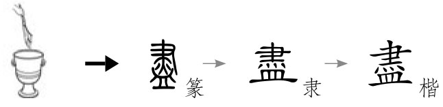 手持毛刷清洁空的盛器。“尽”字本义是指盛器内的东西被全部掏空。繁体字为“盡”,字形采用“皿”作形旁,采用“㶳”作声旁。现在,“尽”也指空无一物的、空的,如“尽头”等。