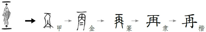 甲骨文的“再”,字形的中间有一条鱼,上下又各加上了一条横画,表示第二次的意思。古文中“再”和“二”有一定的区别,两两相对,就用“二”来表示;一个一个相互堆叠,就用“再”字。现在,“再”常表示更加,如“再勇敢一点”。此外,这个字也可表示先后顺序,如“先写作业,再看电视”。