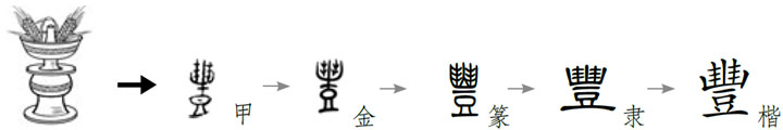 起初,“丰”字有两种含义。第一种含义通“豊”,指古时候盛放祭品的一种器具,形状像豆。甲骨文的“丰”字形下方为“豆”,就说明了这一点。后来,它引申为丰盛。第二种含义为茂盛,用来形容植物枝叶萌发。现在这两种含义都统一为“丰”。各个领域取得的成绩,都可以用“丰”来形容,如“成果丰硕”“丰功伟业”等。