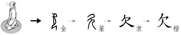 “欠”字本义为哈欠,是一个象形字。在金文中,“欠”字就是一个人面向右边跪着,张着嘴巴,看上去就是一副正在打哈欠的样子。现在,“欠”是汉字的一个部首,带有此部首的汉字,大多都与嘴巴的一些动作有一定的关系,如“吹”“歌”等。现在,“欠”多引申为减少、缺少,如“欠债”“欠安”。