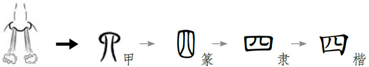 “四”字本义为数字四。在甲骨文和金文中,“四”字也用四横画来表示的,写作“亖”。《说文》中说:“四,阴数也。像四分之形。”后来,“四”字假借为表示气息的意义,写作“