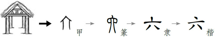 “六”字本义为房舍,是一个象形字。在甲骨文中,“六”的字形很像一间简陋的房屋。后来,“六”被假借为一个表示数目的字,即“六”。但在有的史料中,“六”也是一个表示多数的数字,如“六街三市”,指的是众多的街市。这层含义现在也常见到,如“六亲”在古代指父、母、兄、弟、妻、子,现在则泛指亲人。