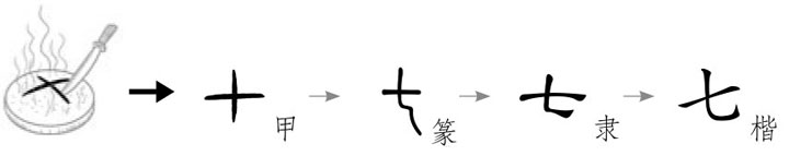 “七”是个指事字,本义就是数字七。甲骨文的“七”,字形像是用刀在木头上刻画下的十字形,后来为了区分“七”和“十”,在小篆字形中,便将“七”字的下方变成了弯折线。“七”也是一种类似于骚体的文体,源自于汉朝枚乘所作的《七发》,后世的主要作品有傅毅的《七激》、刘世广的《七兴》、曹植的《七启》等。