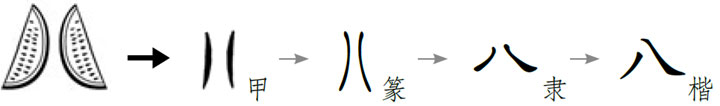 现在,“八”一般只表示数字,古代汉语中固然也有将其用为数字的例子,如《战国策·齐策》中的“邹忌修八尺有余”。但其本义却不是数字:从字形上来看,它就是一个物品被分成了两半,所以本义是相背、分开。现在江浙一带还把送东西给别人叫作“八”,即东西和原主人分离了。