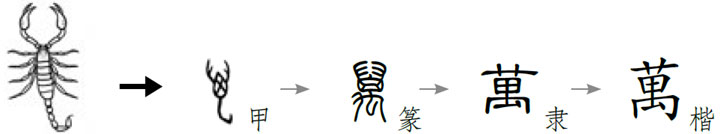 “万”字本义是蝎子,《说文》中说:“万,虫也。”在甲骨文中,是一个象形字,其字形十分形象地展现出了一只蝎子的外形。在“万”字的演化过程中,曾出现了“