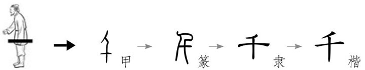 “千”的本义是数目,因为它非常难以表达,所以古人就借用“人”的字形,然后在“人”的上边加一横来表示。在古代典籍里它还通“阡”,古代田地南北向的田埂就叫作“阡”。现在,“千”常比喻数目多,如“千方百计”“千言万语”“千钧一发”等。