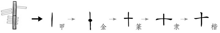 甲骨文在表示数字的时候,用横画表示个位数字,如一横即为“一”,两横即为“二”;“十”则用竖画来表示,即一竖为“十”,两竖为“二十”。可见,我国很早就开始实行十进位了。随着计数方法的改进,到了金文,竖画中间加一圆点表示“十”,有“结绳记数”之义。“十”字的本义就是数字10。