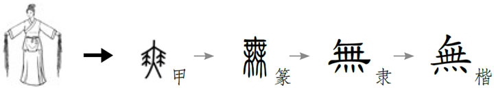“无”字繁体形式为“無”,是“舞”的本字,本义为跳舞,是一个象形字。在甲骨文中,其字形很像人执牛尾跳舞的样子。后来,“無”简化为“无”,意思是没有,而表示“跳舞”之义时则由“舞”代替。现在,人们常说的“无穷无尽”“无妨”等中的“无”都表示没有之义。此外,“无”也可用作连词,如“无论”。