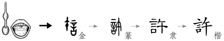 “许”是个形声字,本义是允许。金文的“许”,左边是“午”,表示声旁;右边是“言”,表示形旁,代表与说话有关。小篆的“许”,字形中的“午”和“言”互换了位置。“许”后来引申为期望。现在表示或者、可能,如“也许”“或许”。承认其优点,称“赞许”。女方接受男方求亲,称“许配”“以身相许”。