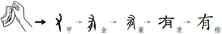 “有”字本义是用手抓物。在甲骨文中,“有”和“又”的字形相同,都是一个右手的形状。从金文开始,“有”字下方加入了一个“月”,“月”在古时代表祭祀用的腊肉;手中抓着一块腊肉,意思是获得。“有”字后经过引申,表示所属、拥有。它还表示存在,如“我们之间有很大的差距”。此外,“有朝一日”的“有”有等待之义。