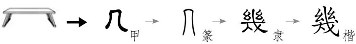 “几”是一个象形字,本来的意思是古人席地而坐时倚靠的坐具,繁体字写作“幾”。小篆的“几”字,像是一个低矮的桌子,可以用来放置各种物品,也可以用来坐卧和倚靠。所谓“五几”指的就是“玉、雕、彤、漆、素”这五种古人使用的礼器。现在,“几”已经成为平常百姓家中的常备家具,如“茶几”。