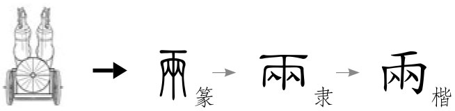 “两”字的本义是指古代双马牵引的战车。当“两”的“战车”本义消失后,篆文再加“车”另造“辆”代替。现在,“两”字也指一双、一与三之间的正整数,如“两岸”,意为水流两旁的陆地。