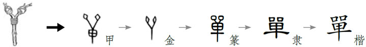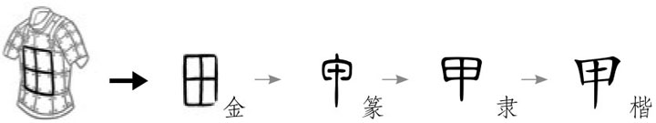 “甲”字最初的字形像是被分为四块甲的方形或圆形,这是根据古代战士作战的铠甲形化而来的,后来简化为“十”字形。因此,“甲”的本义是古代战士作战时所穿的护身衣。“甲”在古代也指武器。“甲”位列十天干的第一位,五行为木,在古代用来纪时。这个字也引申为“第一”之义,如人们常常说的“桂林山水甲天下”。