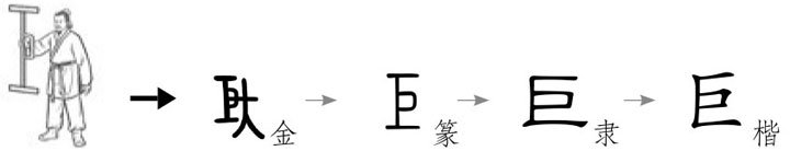 “巨”是个象形字,本义是画直角方形用的工具,和“矩”曾是同一个字。金文的“巨”,就像是一个人手里拿着尺子和量角的工具在度量物件。小篆的“巨”,去掉了右边的“人”形,只留下了左侧工具的形状。后来,“巨”由度量引申为大、很大,如“巨人”指的是身材异常高的人。